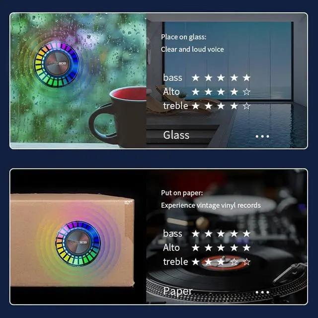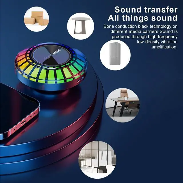 Note: This innovative Bluetooth enabled device is also TWS enabled. ^^ Customized 3W strong magnetic horn + Submersible Low-frequency diaphragm- The original sound presents pure sound quality, and the real small size and loud volume. The special resonance horn unit is used to attach the product to any place through reusable water-washed nano glue the surface of an object, making it resonate and produce sounds with different effects. ^^ Built-in Multiple Light Effects/Powful BatteryIt can be switched at will, and music can be played simultaneously with BT resonance sound, sound and light synchronization, bring you audio-visual synchronization enjoyment, make you happy physically and mentally. The speaker comes with 400mah built-in battery, supporting to play for 4 hrs. With built-in microphone, the bone conduction speaker can play music, podcasts, support separate phone conversations/conference calls, play games or movies.