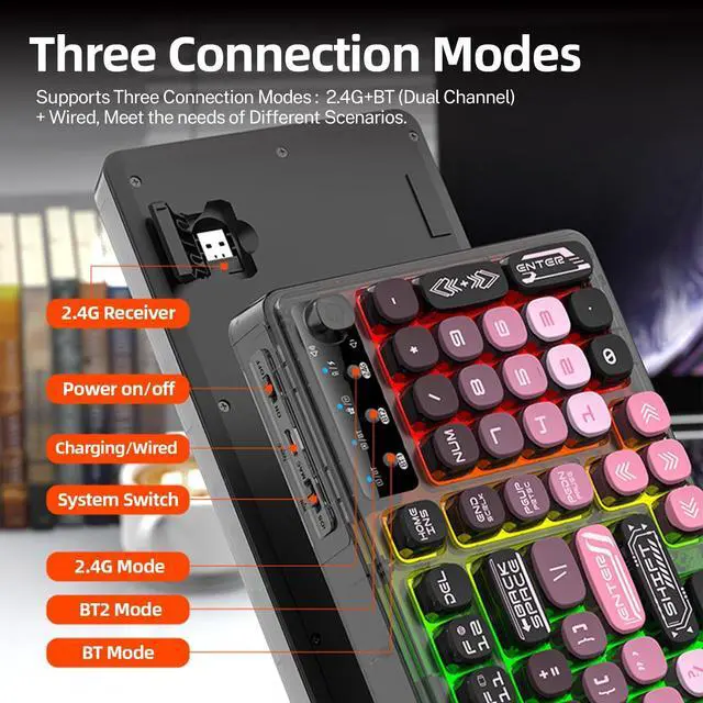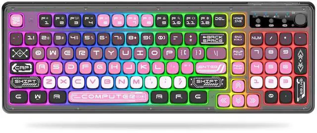 Pink Transparent Gaming Keyboard: Your Tri-Mode RGB Companion for Work & PlayEngineered for gamers and productivity seekers alike, this keyboard merges stunning aesthetics with versatile functionality. The unique transparent chassis and gradient pink keycaps create a centerpiece for your desk, while its tri-mode connectivity and long-lasting battery ensure uncompromisedperformance whether you're gaming, working, or creating.