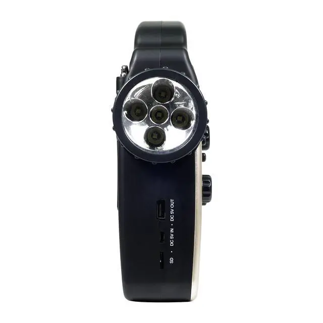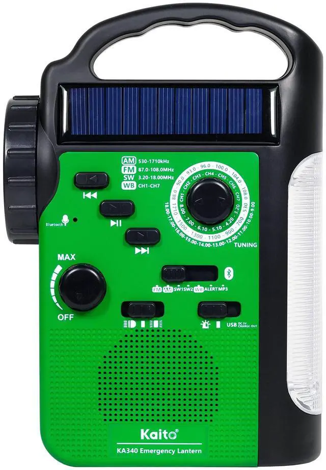 5-Way powered do-it-all camping lantern and emergency radio: hand crank generator, photovoltaic cells, built-in li ion rechargeable battery (non-replaceable), 5V micro USB input (charging cable included), 3 AA batteries (not included) ^^ Comprehensive broadcasting coverage includes local AM/FM, 24/7 NOAA weather channels as well as shortwave stations around the globe; Weather alert function automatically activates the radio in the event of an emergency, such as hurricane, earthquake, flood, tornado, thunderstorm, wild fire, and other warnings ^^ Built-in li-ion 2, 300 mAh rechargeable battery provides 16 hours of lighting, or 20 hours radio playing time, or fully charges most of the mobile phones once with a standard plug-n-charge 5V USB output, compatible with both Apple and Android smart phones ^^ Playing your favorites tunes loud and clear by wireless streaming from your smart phone, tablet computer, or any other Bluetooth-enabled device, or using a micro-SD memory card (MP3 only and 32GB maximum) ^^ A versatile and indispensable device for every household, and a dependable and reliable tool even when everything else fails, suitable applications include camping, backpacking, picnic, other outdoors recreational activities, and emergency / disaster preparedness, roadside emergency, and etc.