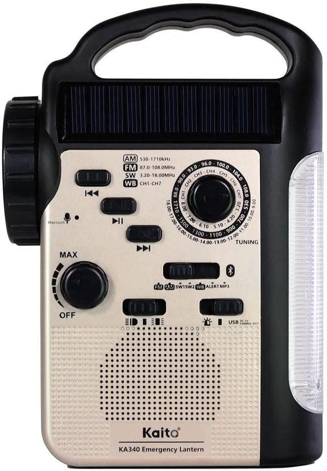5-Way powered do-it-all camping lantern and emergency radio: hand crank generator, photovoltaic cells, built-in li ion rechargeable battery (non-replaceable), 5V micro USB input (charging cable included), 3 AA batteries (not included) ^^ Comprehensive broadcasting coverage includes local AM/FM, 24/7 NOAA weather channels as well as shortwave stations around the globe; Weather alert function automatically activates the radio in the event of an emergency, such as hurricane, earthquake, flood, tornado, thunderstorm, wild fire, and other warnings ^^ Built-in li-ion 2, 300 mAh rechargeable battery provides 16 hours of lighting, or 20 hours radio playing time, or fully charges most of the mobile phones once with a standard plug-n-charge 5V USB output, compatible with both Apple and Android smart phones ^^ Playing your favorites tunes loud and clear by wireless streaming from your smart phone, tablet computer, or any other Bluetooth-enabled device, or using a micro-SD memory card (MP3 only and 32GB maximum) ^^ A versatile and indispensable device for every household, and a dependable and reliable tool even when everything else fails, suitable applications include camping, backpacking, picnic, other outdoors recreational activities, and emergency / disaster preparedness, roadside emergency, and etc.