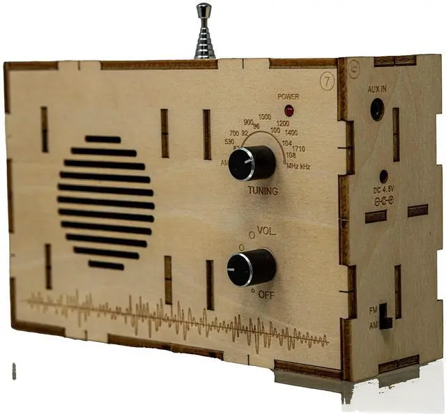 Assemble this kit to build a fully functional AM (530-1710 KHz) and FM (87.0-108.0 MHz) radio receiver with wooden enclosure, telescopic antenna, tuning knob, volume control knob, speaker and 2.5 mm auxiliary input