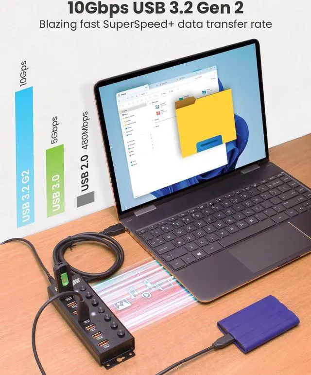 [ Blazing-Fast Data Transfer ]: Experience SuperSpeed USB 3.2 Gen 2 performance on each port, with transfer rates reaching up to 10Gbps, ensuring rapid and reliable data handling for all your connected devices.