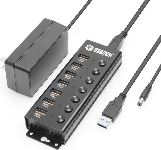 Usbgear 7-Port USB 3.2 Gen 2 Hub - 10Gbps, Individual Power Switches, and Mountable Design for Workspaces & Labs