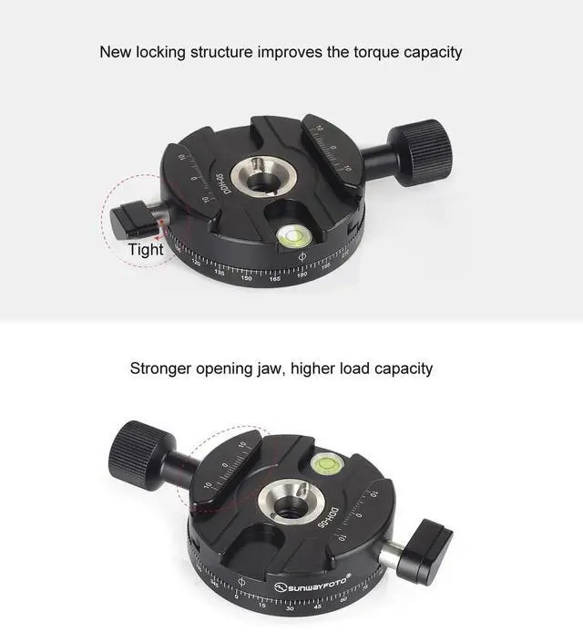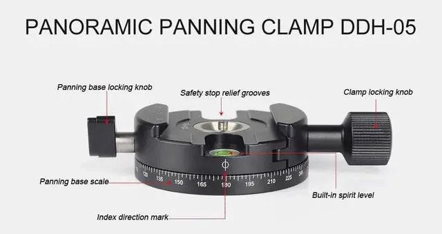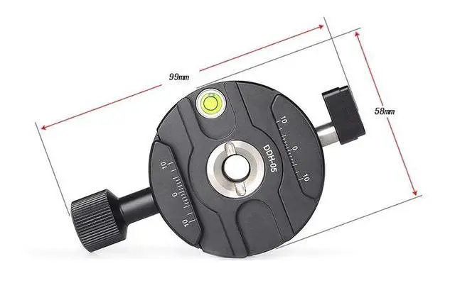 Diameter: 58mm/ 2.3 in. ^^ Height: 26mm/ 1.1 in. ^^ Length: 80mm/ 3.1 in. ^^ Thread Socket Diameter: 8mm/ 0.3 in. ^^ Net Weight: 135g/ 4.76 oz. ^^ Includes Bubble Level ^^ Includes 1/4 to 3/8" Bushing Adapter, 2 Mounting Screws, Allen Wrench.