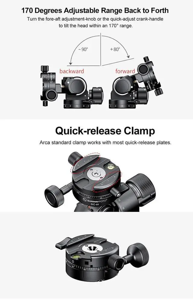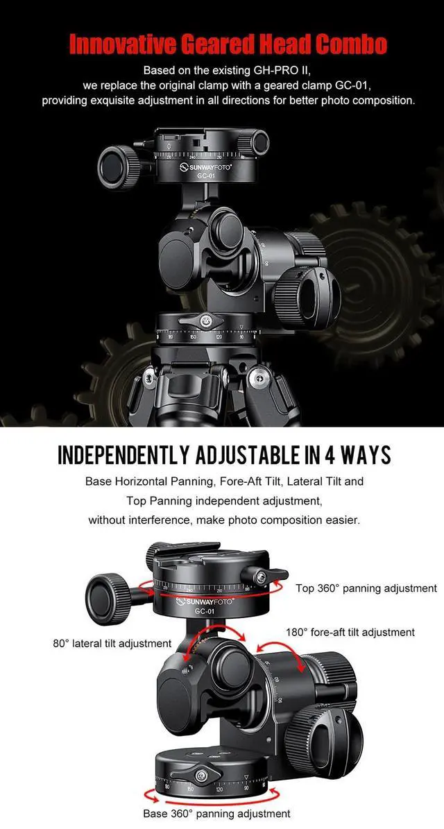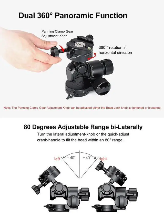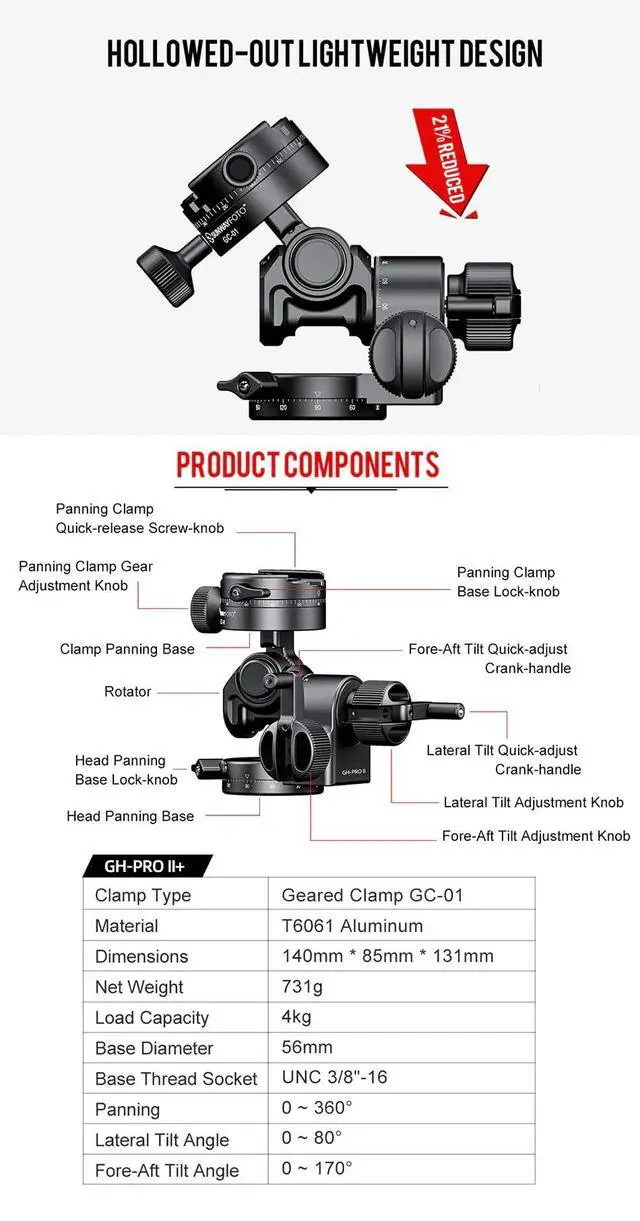 Light-weight design without affecting the functionality or stability of the head, weighing only 731g gram. Base Horizontal Panning, Fore-Aft Tilt, Lateral Tilt and Top Panning independent adjustment, without interference, make photo composition easier. All-metal gear system ensures stability of the head as well as its longevity, capable of bearing up to 4kgs. in testing for most equipment. Easy to position. Exquisite gear drive ensures easy composition of a photo without locking the head.