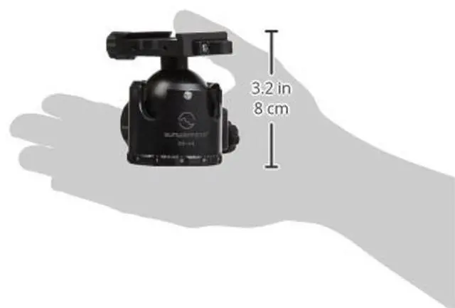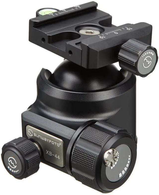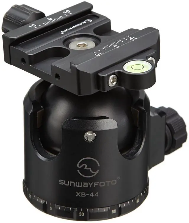 SUNWAYFOTO brand Arca-Swiss compatible. Low profile Tripod Ballhead XB-44. Low Center of Gravity. Very versatile Jaw opening range of 37.25 mm to 41.5 mm will accommodate any Arca style plate from various makers including: Really right stuff (RRS), Wimberley, Jobu Design, Arca Swiss, Kirk Enterprises, Markins, etc. 88lb Max load! Eliptical Ball for progressive resistance. Y-axis diameter 0.03 mm longer than the X-axis. Two drop notch design. One for portrait, one for tilting. Super Stong shell. All Metal knobs. For long term durability. 50mm clamp w Bubble Level. Main Lock Knob Scale Ring. Laser-engraved with index marks. Pan Lock Knob and Panning Base ScaleIndependent Pan Lock Knob, 360 panning movement with calibrated precision, precisely capture overlapping panoramic images. Panning Base is laser-engraved with index marks in 5 increments.