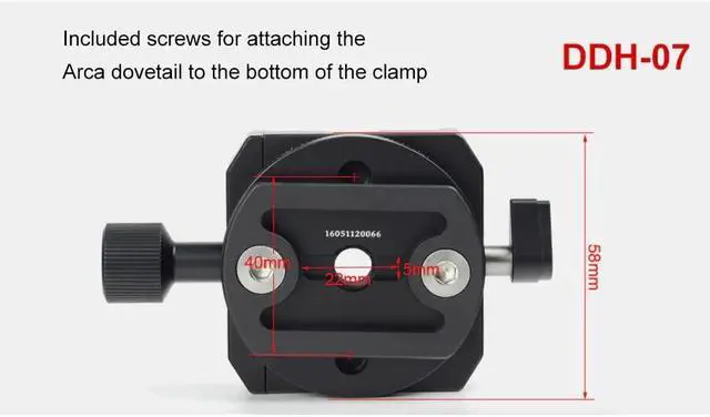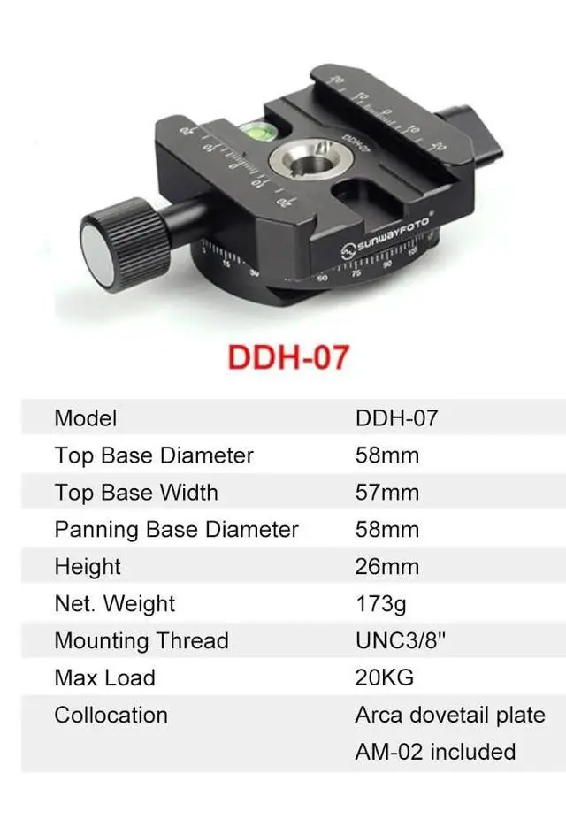 Diameter: 58mm/ 2.3 in. ^^ Height: 26mm/ 1.1 in. ^^ Length: 80mm/ 3.1 in. ^^ Thread Socket Diameter: 3/8" ^^ Net Weight: 173g/ 6.1 oz. ^^ Includes Bubble Level ^^ Includes Removeable Dovetail, 2 Mounting Screws, Allen Wrench.