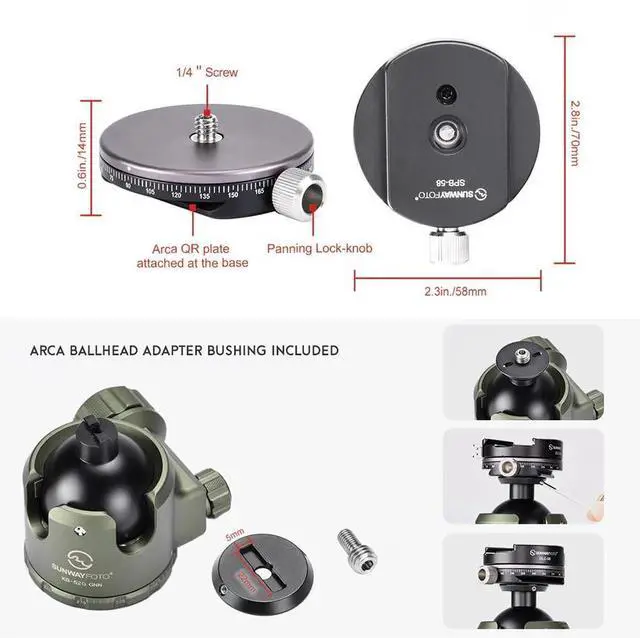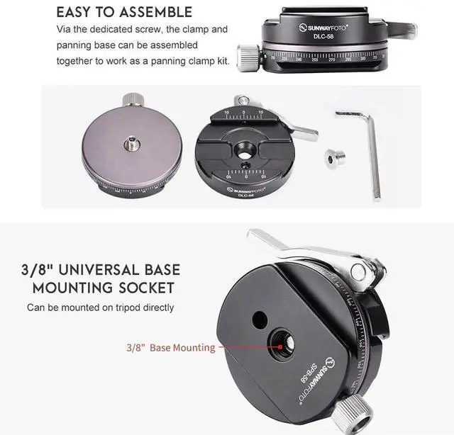 SPB-58T panning clamp kit consists of a discal clamp DLC-58 and a rotator SPB-58. They are detachable and each can be used independently.