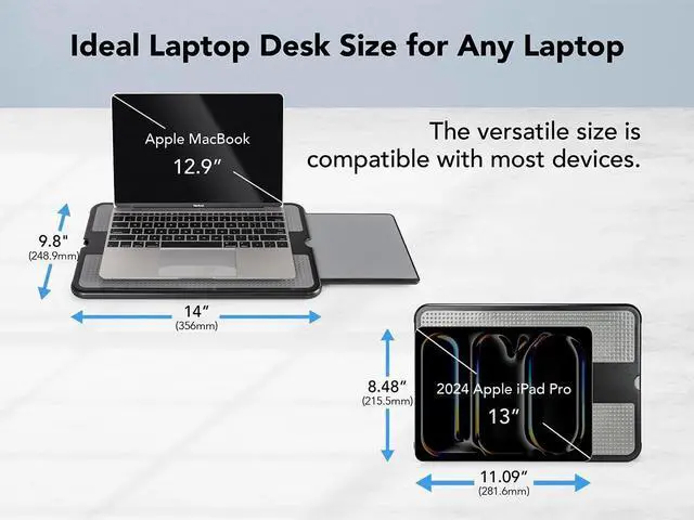 No Desk? No Problem Create a stable workspace on your bed, couch, or while traveling, so youre never limited by your environment. ^^ Cluttered Surfaces? Keep your laptop, tablet, and accessories organized on one surface instead of balancing them awkwardly on your lap. ^^ Neck & Shoulder Strain? Elevates your device to a more ergonomic height, reducing discomfort from hunching over flat surfaces. ^^ Nowhere for a Mouse? Built-in mouse pad provides smooth, accurate tracking so you dont have to struggle with uneven couch cushions or blankets.
