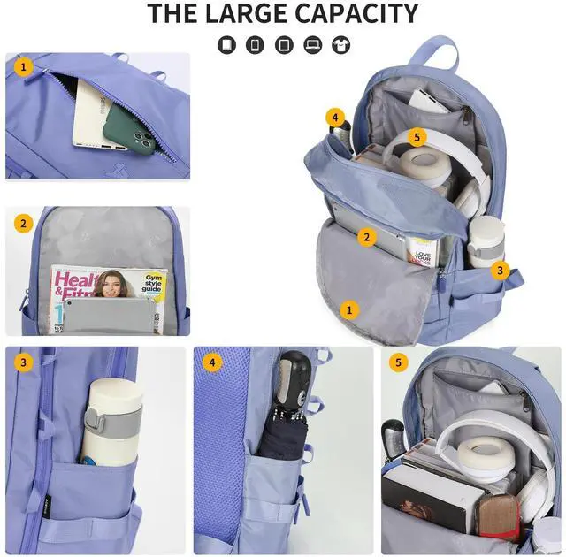 Lots of Storage Space and Pockets: Lightweight laptop back pack features a large capacity design with a compartment for 15.6 inch computer, a spacious packing compartment to hold daily necessities, tech electronic accessories, clothes, etc. The front pocket can hold an ipad, magazines, and other necessities. The side pockets can hold an umbrella and a water bottle