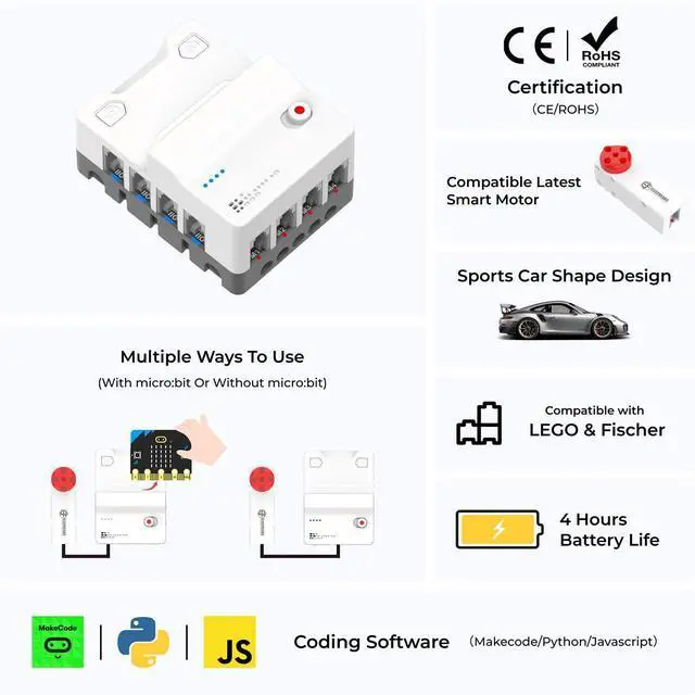 It not only integrates two convenient motor control buttons and a 4-way motor driver, but also comes with an 8-way sensor expansion port, providing students with a versatile platform for experimentation and exploration. These motor control buttons allow direct control of the motor's direction of rotation without connecting the micro: bit, increasing flexibility of operation. All interfaces use RJ11 connectors with a dud-proof, anti-reverse plug design to ensure fast and accurate connections.