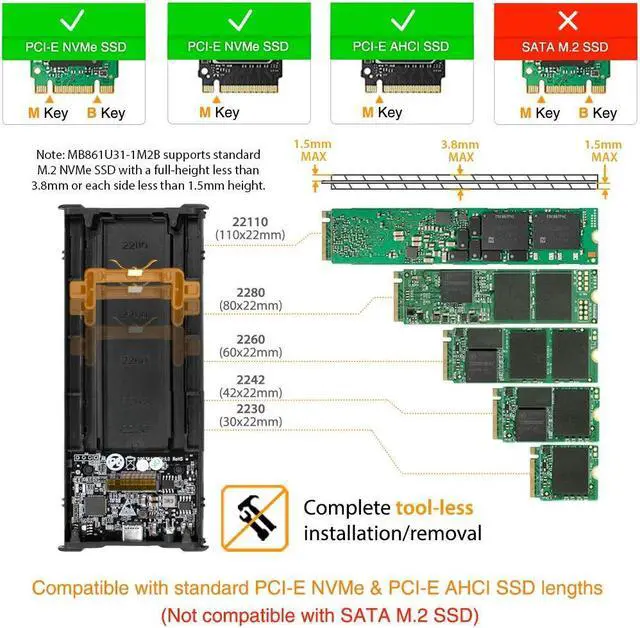 Fits 1x M.2 PCIe NVMe SSD of all length - 30mm (2230), 42mm (2242), 60mm (2260), 80mm (2280), and 110mm (22110)