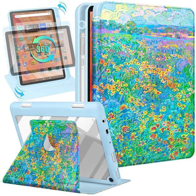 Kidcube for Kindle Fire HD 10/10 Plus Tablet Case - 13th/11th Generation (2023/2021) 10.1" Women Girls Cute Teens Design Floral Rotating Stand Pencil Holder Folio Cases for Fire HD 10/10 Plus
