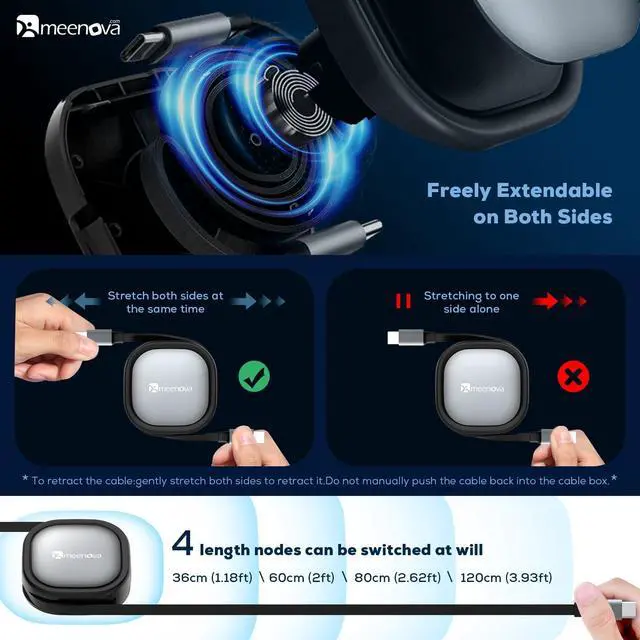 [(Fully Retractable Charger Cable)] : The other retractable cables can not be stored fully in the box. Our retractable cable can be completely stored in the box. It smoothly, easily, and quickly uncoils/coils the cable. You can say goodbye to tangled cables and a messy charging environment. It is the perfect choice for travel, office, home, outside, et