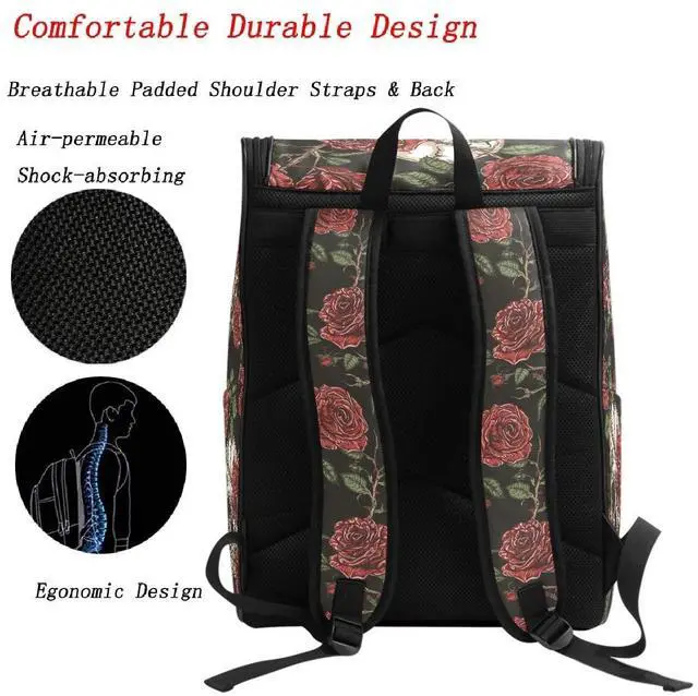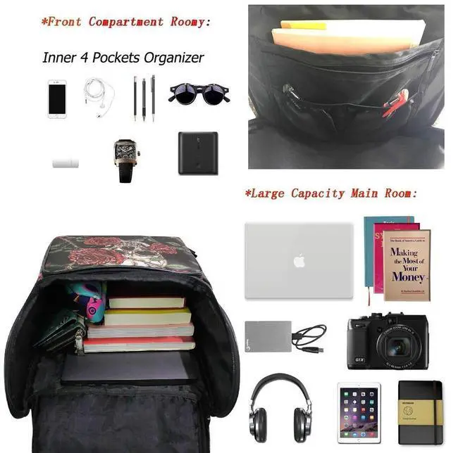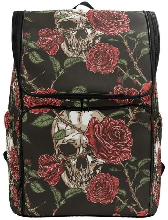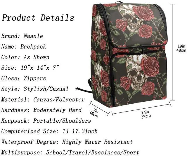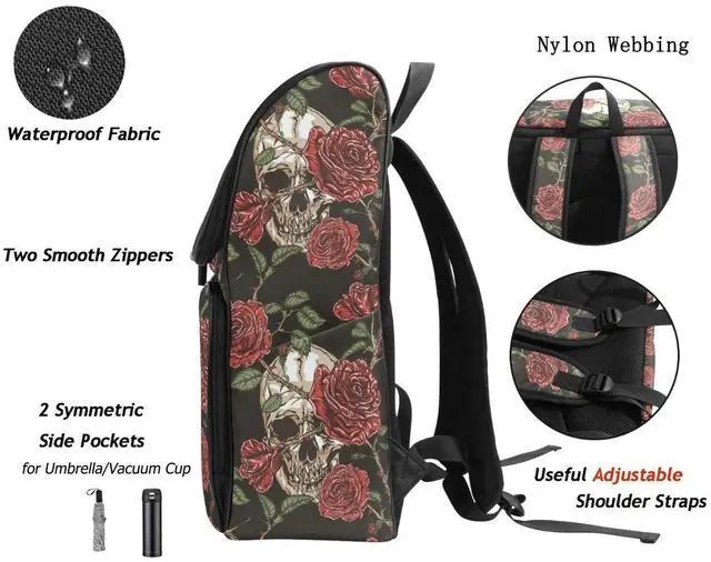 Naanle Trendy Skull Rose Floral Pattern Casual Daypack College Students Multipurpose Backpack Large Travel Hiking Bags Computer Bag for Men Women