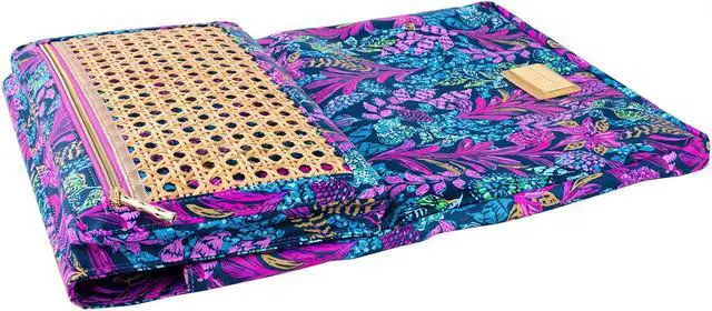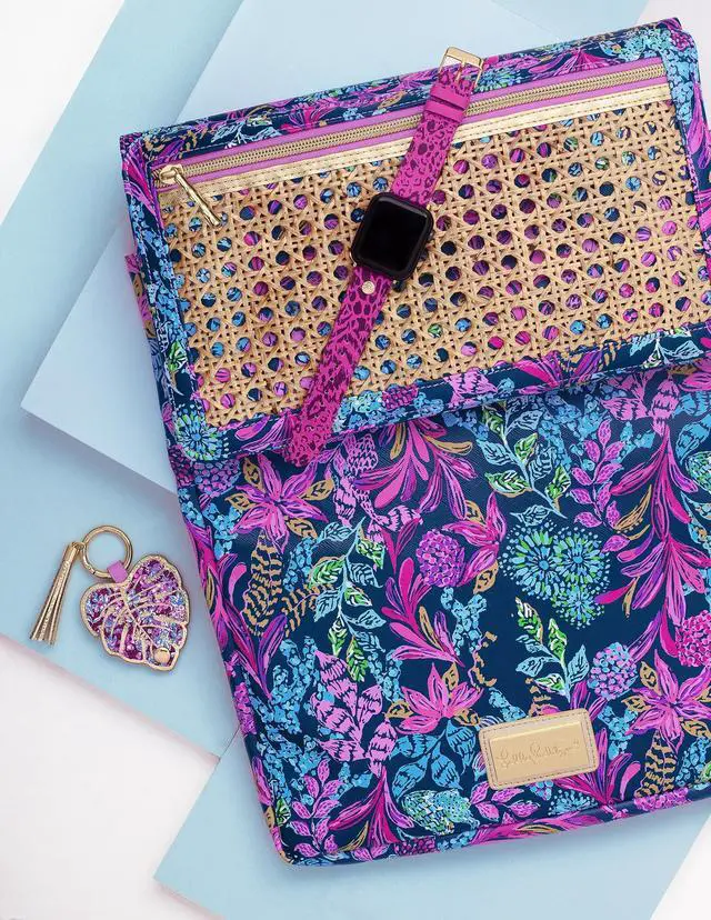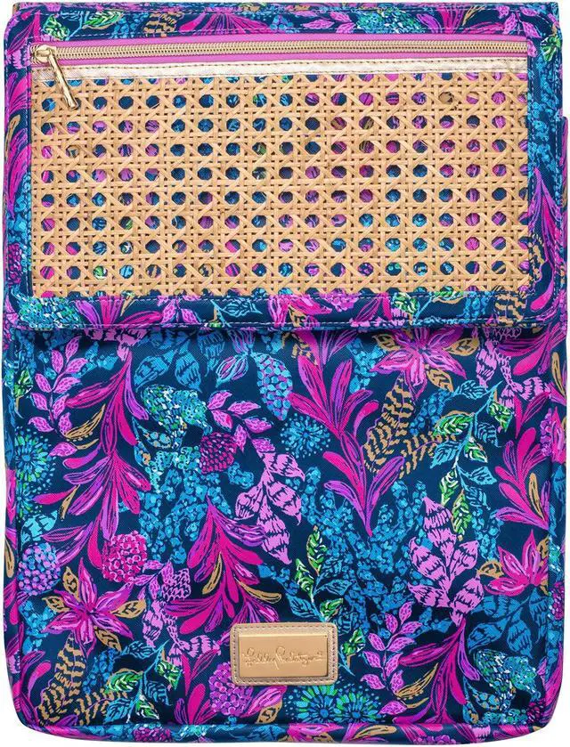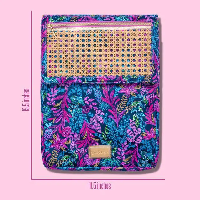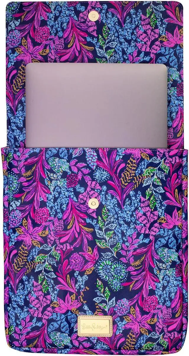 Keep your devices safe and sound in this stylish tech pouch set by Lilly Pulitzer. The laptop case 14 inch features a soft interior lining that allows laptops to easily glide in/out and is lightly padded for added security and protection as you travel. Plus, it has a handy zip pouch built into the front that's perfect for storing your charging cords, earbuds, and other must-have accessories. The zipper laptop sleeve case is featured in a multicolored Lilly Pulitzer print, with caning detail and a metal logo plaque for an upscale look.