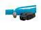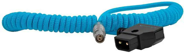 Coiled D-Tap to Female LEMO 2 Pin For RED KOMODO is a blue coiled braided cable for connecting a professional V-mount or Gold mount battery to a Komodo camera. The cable has a D-Tap on one end and a 2-pin Female LEMO on the other wired specifically for
