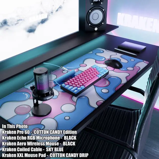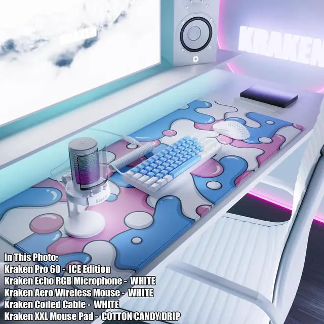 Kraken Keyboards DRIP EDITION XXL GAMING MOUSE PAD - COTTON CANDY The Kraken XXL Gaming Mouse Pad brings the colors you LOVE into a subtle, yet distinct design to perfectly tie your gaming setup together!