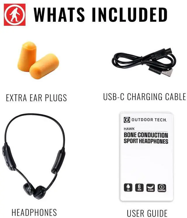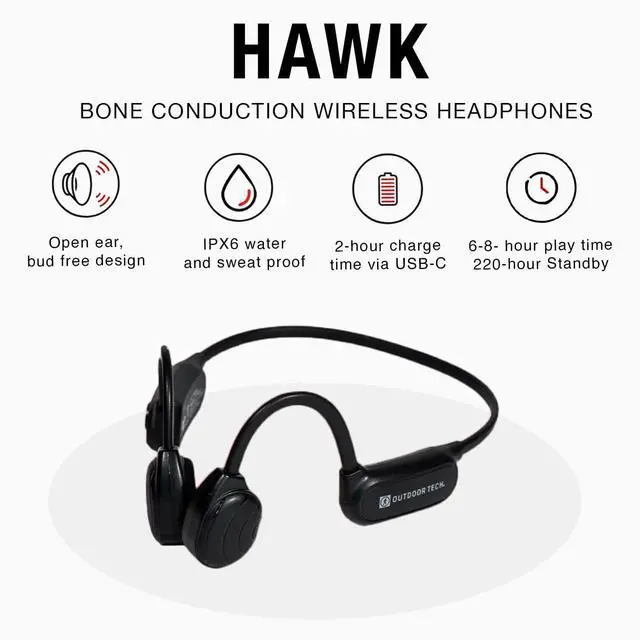 Hawk is Outdoor Tech's first introduction of bone conduction technology. This wireless Bluetooth tech is open ear and allows the listener to enjoy music and take calls while being able to hear what is going on around them. The comfortable, bud-free design wraps around and over the ear and has easy press controls. Ideal for activities like running, cycling, and your day-to-day commute. The IPX6 waterproof and sweatproof rating make Hawk a great option for any type of activity. Enjoy up to 8 hours of continuous playback and clear calls with 220-hour standby time.
