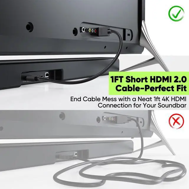 4K HDMI Cable Short 1 FTSupports 4K@60Hz, 2K@120Hz / 144Hz / 165Hz, 1080P, HDCP 2.2, 48bit/px HDR color depth, TrueHD 7.1 audio, Audio Return Channel (ARC) and Ethernet. Perfect for all HDMI 2.0 standard devices, backward-compatible with all HDMI versions including 1.4 / 1.3 / 1.2 / 1.1, and delivers ultra-high-speed 18Gbps 4K transmission. ^^ Shielded Short HDMI 2.0 Cable 1 FootOnly 1FT in inner length, purpose-built for TV installations, desktop workstations and cameras connected to monitorshelps you achieve a mess-free setup and this short HDMI cable 1 foot helps eliminate messy spaghetti wiring in TV cabinets, desks or AV stations, giving you a clean and organized look.