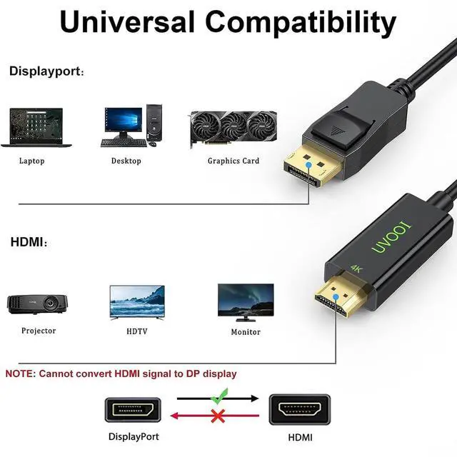 Note: This is Unidirectional, only converts signal from source DisplayPort to HDMI display). ^^ UHD 4K Immersive Viewing ExperienceThis DP to HDMI Cable supports stunning video quality up to 4K (38402160) at 30Hz, as well as 19201200 or Full HD 1080p at 60Hz. Combined with flawless uncompressed digital audioincluding 7.1, 5.1, or 2-channel configurationsit amplifies the wonder of your viewing immersion. ^^ Mirror and Extended Models, Enrich Your LifeConnect these dp to hdmi cable from your old all small laptop to large monitor for mirror and extended model. Mirror Mode-Elevates your holiday photos and favorite films onto the big screen for a more captivating and enjoyable viewing experience. Extended Mode-Effectively doubles your workspace for improved productivity, or lets you enjoy a movie while tackling lighter tasks. ^^ No Flicker, No BlackUL 20276 shielded dp to hdmi cable, Gold-plated connectors, bare copper conductors, and foil & braid shielding combine together to provide both superior cable performance and reliable connectivity. ^^ WarrantyOnly converts signal from DP to HDMI on one way. This displayport to hdmi cable is not bi-directional. All our products provide lifetime warranty, maintenance of life.