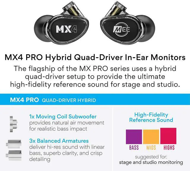 QUAD-DRIVER HYBRID IEM: The flagship of the MEE Professional MX PRO in-ear monitor series, the MX4 PRO utilizes a four-driver hybrid setup with a 10mm dynamic subwoofer and three balanced armatures to deliver linear bass, exceptional clarity, and crisp detail; with balanced sound tuning and quad-driver resolution, the MX4 PRO delivers the ultimate high-fidelity reference sound for stage and studio ^^