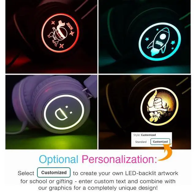LIGHT-UP DESIGNS: multicolor LED lights with 8 color patterns illuminate the graphics on each ear cup with no batteries required, giving each KidJamz headphone a vibrant and unique style thats hard for kids to resist and easy for parents to love! ^^