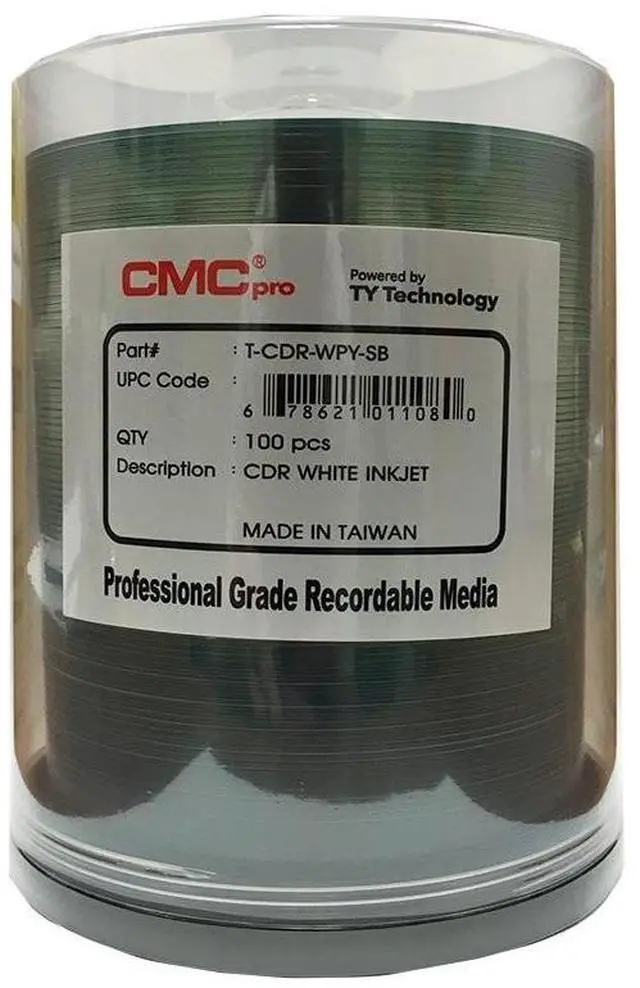 This disc has a white inkjet top surface, and a blue/green (cyanine) recording surface, with a maximum recording speed of 48x. It will work with Rimage 2000i, Microboards Print factory, Epson Discproducer, Primera Bravo and many other inkjet disc printers and publishers. It is packaged in 100 pc cake box/spindles. This product is not designed to work in a Rimage Everest printer. This product is not recommended for screen printing.
