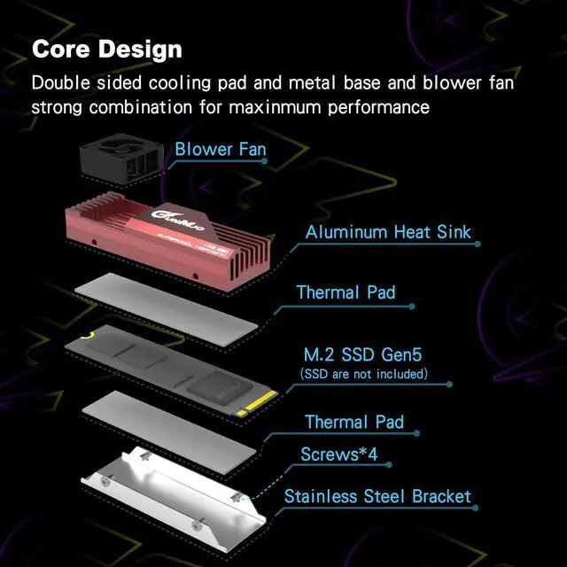 Unique patented fan merged structure: advanced and unique technology breakthrough with a compact Blower fan which has 12000 RPM/min, 60000 hours life, cooling effect 5C-30C (depending on the environment). Cooling your SSD to a safe temperature, to avoid overheating and throttled ^^