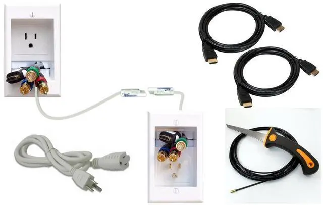 DIY powerbridge one-ck recessed in-wall cable management system with power connect for wall-mounted flat screen LED, LCD, and Plasma TV's includes two 3-meter length HDMI cables. installation kit includes drywall saw to cut drywall and cable puller to assist with routing cables Inside wall.