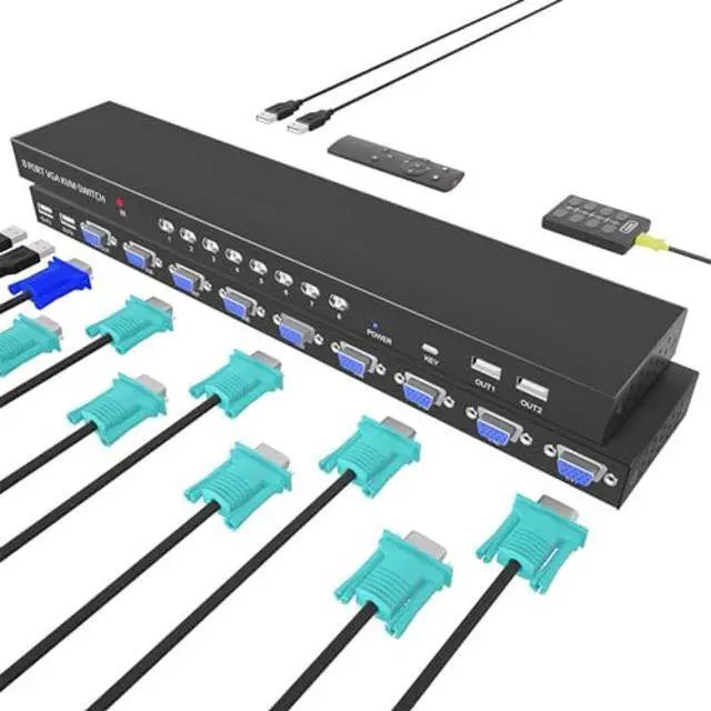 1080P Full HD - KVM switch VGA 8 port supports up to 1920*1440 resolution and ultra-wide screen display, supports high quality auto-recognition. KVM switch USB includes 8 KVM VGA cables, 1 remote 1 desktop controller.
