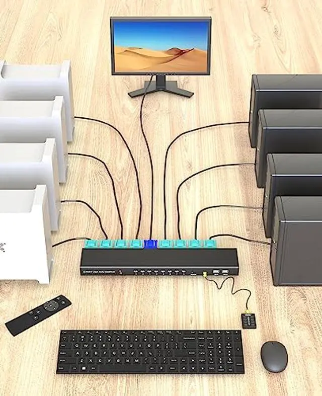 VGA KVM Switch - 8 Port USB KVM Switch allows 8 computers to share a keyboard mouse monitor, this VGA KVM switch can also share 4 USB 2.0 devices such as printer, scanner, keyboard, mouse, card reader, USB stick, flash drive, portable hard drive, SSD drive between two computers.