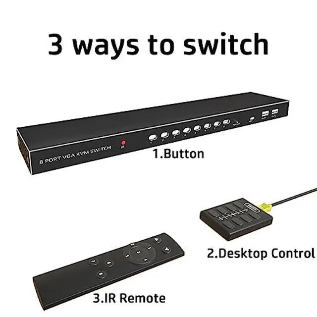 3 ways to switch - 8 port USB VGA KVM switch can be controlled by buttons ,remote or desktop controller, using the desktop controller will clean the office desktop, no messy cables on the desktop, clean and clear
