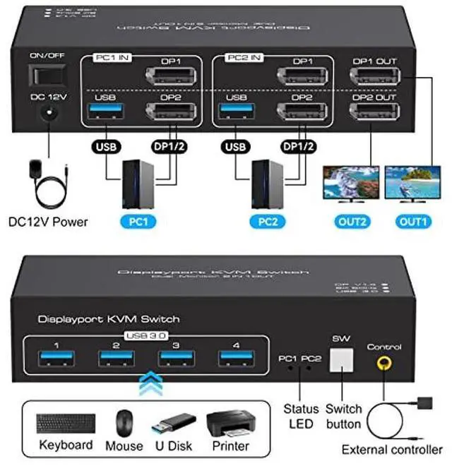 [(USB 3.0 KVM Switch)] Dual Monitor Displayport KVM Switch with 4 USB 3.0 ports. The transmission speed of each port is up to 5Gbps, and the data transmission performance is much higher than that of USB 2.0;(Note:US