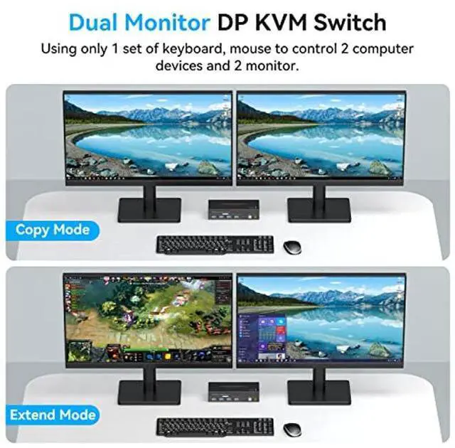 [(Display Port KVM Switch 2 PC 2 Monitor)] Displayport KVM switches allow two computers to share two high-definition monitors and 4 USB 3.0 ports, such as mouse, keyboard, printer U disk, etc. And connect two displays in extend or duplicate display mode. Extended Mode: PC host in output 2 different images on 2 monitors. Copy Mode: Computer host outputs 2 identical images on 2 monitors. (Note: Please make sure your computer supports multi-display and each connected computer requires 2 DP ports)