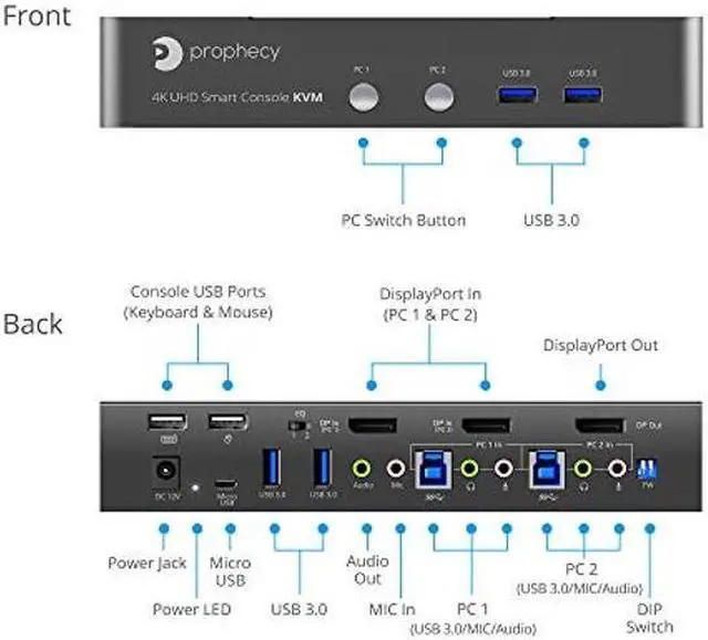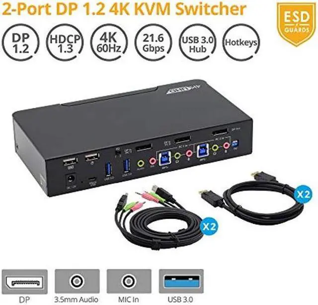 gofanco Prophecy 2-Port DisplayPort 1.2 USB KVM Switch - 4K @60Hz 4:4: 4, 21.6G bps, HDCP 1.3, USB Keyboard/Mouse, USB 3.0 Hub, MIC in, Stereo Out, Hotkeys, TAA Compliant (PRO-KVMDP-2Pv2)