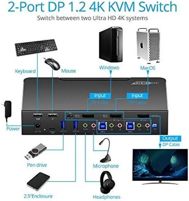 COMPLETE KVM KIT - Easily switch between 2 DisplayPort computers on 1 monitor, using the same mouse and keyboard. This is a 2-Port KVM Switch with DisplayPort (Video), USB Keyboard/Mouse, and Stereo Out and Mic In. All cables are included in the package