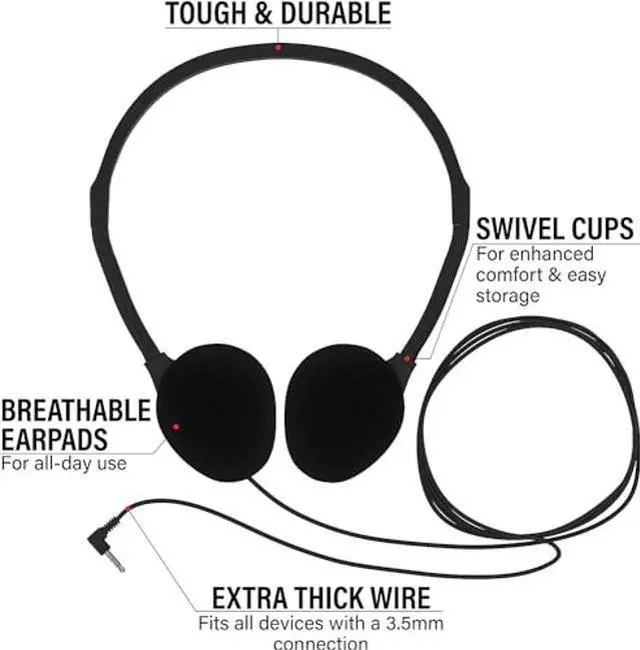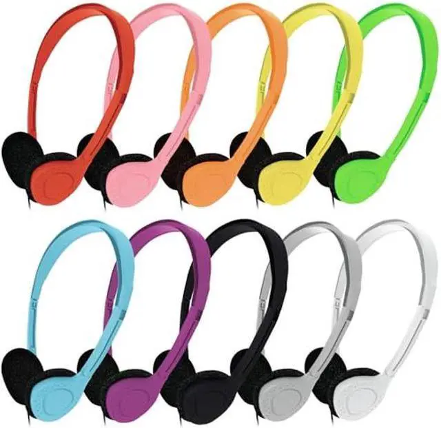 Wholesale Bundle Pack of 20 Bulk Headphones, with each headset individually packaged. Includes 10 Colors; Blue, Pink, Red, Green, Purple, Orange, Yellow, Gray, Black and White. Our design is kid-friendly and great for all ages. Suitable for airplane travel, school classrooms, library, museums, learning and standardized testing experiences for all ages.