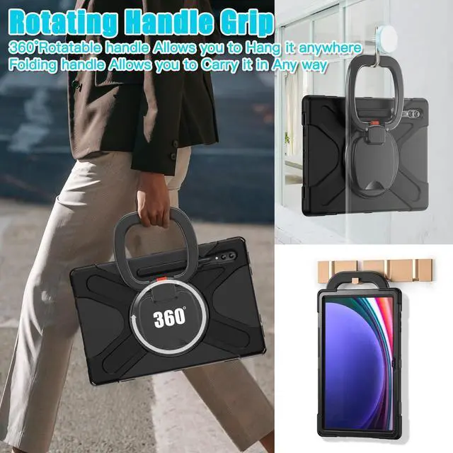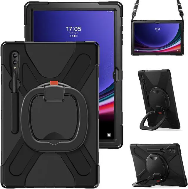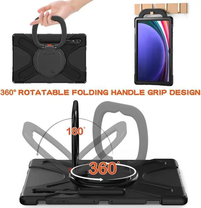 360 Rotation Case for Samsung Galaxy S9 Ultra 14.6 '' 2023/S8 Ultra 14.6 '' 2022, with Shoulder Strap S Pen Holder Rotatable Kickstand/Handle Rugged Silicone Case (Balck)