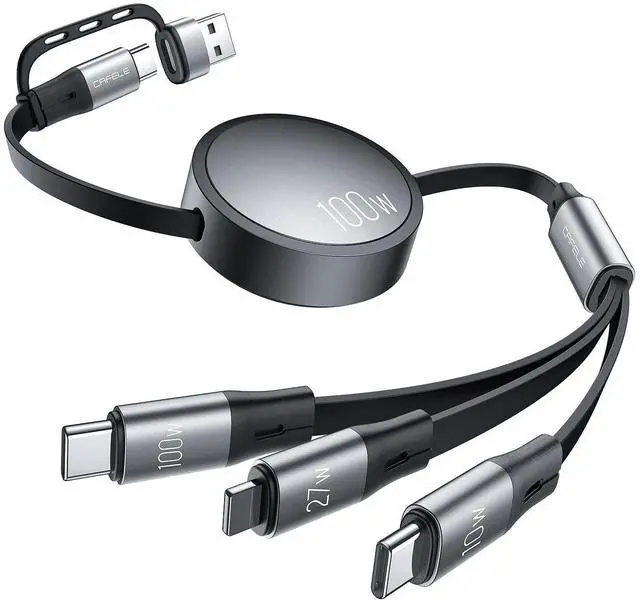 Cable with Safety: Equipped with an E-Mark chip and high-purity copper wiring, this charging cables for multiple devices delivers blazing-fast 100W Power Deliverycharging a MBook Pro 16" to 38% or a Galaxy S24 Ultra to 80% in 30 minutes! The 27W L port ensures Phones 14/13/12 charge at full speed without overheating, while smart trickle charging protects battery health. One retractable chargers for multiple devices to rule them all! ^^ Smart Retractable Charging Cable Tangle-Free & Adjustable: Pioneering pull-sync technology - Pull one end, both extend (competitors require two ends! ) Customize length from 1.15 ft to 3.61 ft with this retractable phone chargerperfect for couch, car backseat, or bedside use. The innovative charging cords for multiple devices design eliminates tangles and fits effortlessly in pockets or bags. Say goodbye to messy chargers for multiple devices! ^^ Universal Compatibility Multi Charger Cable for