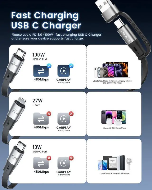 Power Up Faster: This retractable USB C cable combines 2 USB-C (100W PD+10W) and a 27W L Phone portthe true multi charger for all devices. Charge your MBook Pro at 100W, Phone 14/13/12 at 27W (2x faster than standard 10W cables), and USB-C devices like Phone 16/15 and Galaxy S24/S23 simultaneously. No more juggling multi phone chargersthis charger with multiple connectors is your all-in-one power solution for travel, home, or office. ^^ 100W PD Fast Charge Smart USB C Multi Charging
