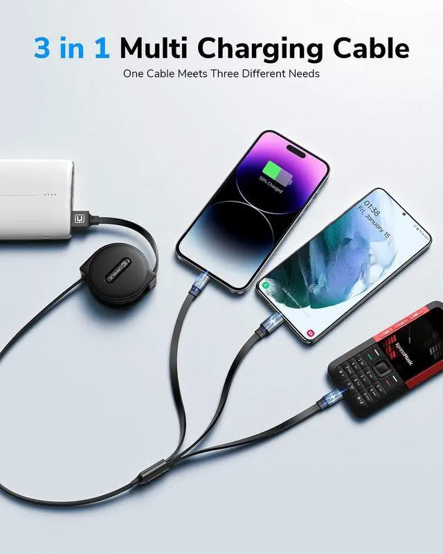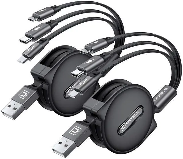 3-in-1 Multi Charging CableOne Cable, Triple Power! The CAFELE retractable charging cable combines USB-C, Micro USB, and iP connectors into a single multi cord charger cable, eliminating the hassle of carrying multiple cords. Perfect for phones, tablets, laptops, power banks, car chargers, and small appliancescharge three devices simultaneously with ease. Save money, space, and time with this charging cable for multiple devices! ^^ Universal CompatibilityWorks with everything! This 15W 3A retractable multi charging cord for multiple devices is compatible with: Phone 16 15 14 13 12 11 Pro Max/16 15 14 13 12 11 Pro/15 14 13 12 mini/16 15 14 Plus/16 15 14 13 12 11/SE/Xs Max/Xs/Xr/X/8 Plus/8/7 Plus/7/6s Plus/6s/6 Plus/6/5/5s, Pad/Pad Air/Pro/Mini and other tablets, Pod/ Galaxy UItra/S24+/S24/S23+/S23/S22+/S22/S21+/S21/S20+/S20/S10+/S10/S9/S8/Note 9/8, Google Pixel, Moto and other Android phones, PS 4/5 controllers, power banks & more! ^^ Wider Occasion UsedPerfect for tavel, work & play! Compact yet powerful, this 3-in-1 retractable phone charger for car and daily use is ideal for road trips, business travel, home, office, beach outings, cafes. 2-Pack BundleShare charging ports with friends and family effortlessly! ^^ Portable & RetractableTangle-Free, space-saving design! Adjustable lengths ( 0.6 ft- 1.6 ft- 2.3 ft-3ft-4ft) adapt to any scenariocar, home, office, desk, or bedside. Simply pull both sides to retract smoothly (avoid single-side pulling to prevent jams). Fits neatly in pockets, bags, or glove compartments. ^^ Safe Charging & Fast Data SyncAdopted pure copper wire and smart chip to lower resistance, the output current can be up to 3A fast charging. This multi charging cable ensures safe charging and protects your battery.