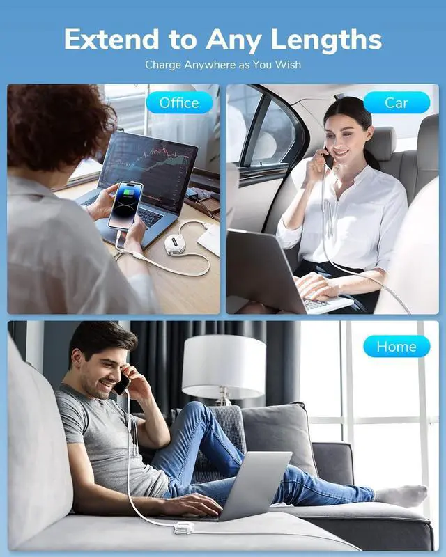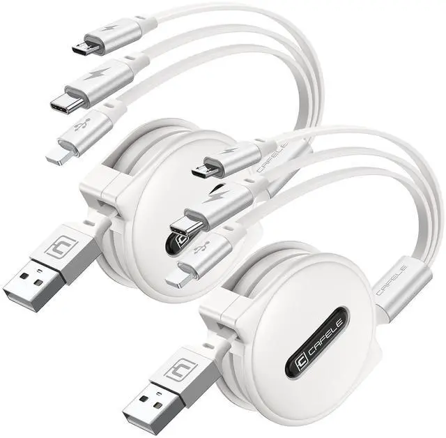 3-in-1 Multi Charging CableOne Cable, Triple Power! The CAFELE retractable charging cable combines USB-C, Micro USB, and iP connectors into a single multi cord charger cable, eliminating the hassle of carrying multiple cords. Perfect for phones, tablets, laptops, power banks, car chargers, and small appliancescharge three devices simultaneously with ease. Save money, space, and time with this charging cable for multiple devices! ^^ Universal CompatibilityWorks with everything! This 15W 3A retractable multi charging cord for multiple devices is compatible with: Phone 16 15 14 13 12 11 Pro Max/16 15 14 13 12 11 Pro/15 14 13 12 mini/16 15 14 Plus/16 15 14 13 12 11/SE/Xs Max/Xs/Xr/X/8 Plus/8/7 Plus/7/6s Plus/6s/6 Plus/6/5/5s, Pad/Pad Air/Pro/Mini and other tablets, Pod/ Galaxy UItra/S24+/S24/S23+/S23/S22+/S22/S21+/S21/S20+/S20/S10+/S10/S9/S8/Note 9/8, Google Pixel, Moto and other Android phones, PS 4/5 controllers, power banks & more! ^^ Wider Occasion UsedPerfect for tavel, work & play! Compact yet powerful, this 3-in-1 retractable usb charging cable and daily use is ideal for road trips, business travel, home, office, beach outings, cafes. 2-Pack BundleShare charging ports with friends and family effortlessly! ^^ Portable & RetractableTangle-Free, space-saving design! Adjustable lengths ( 0.6 ft- 1.6 ft- 2.3 ft-3ft-4ft) adapt to any scenariocar, home, office, desk, or bedside. Simply pull both sides to retract smoothly (avoid single-side pulling to prevent jams). Fits neatly in pockets, bags, or glove compartments. ^^ Safe Charging & Fast Data SyncAdopted pure copper wire and smart chip to lower resistance, the output current can be up to 3A fast charging. This 3 way multi charging cable ensures safe charging and protects your battery.