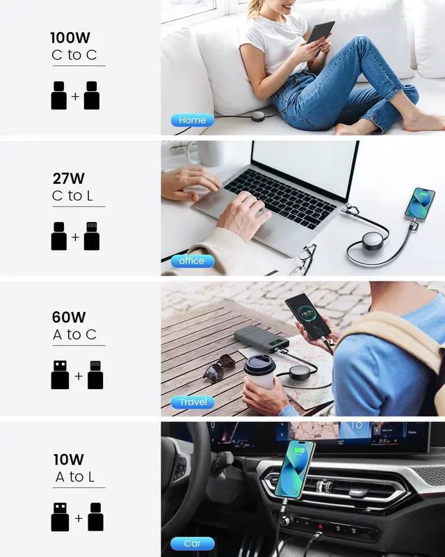 [5-in-1 Multi Charging Cable Versatile Power for All Devices] This multi cord charger cable combines C-to-C (100W PD), C-to-L (27W), A-to-C (60W), and A-to-L (10W) the ultimate charging cable for multiple devices that replaces your MBook Pro/Air, Phone 17/16/15/14 Pro Max, Galaxy S25/S24 Ultra, and Pad Air/Pro chargers all at once. ^^ [100W Retractable USB C Cable Blazing Fast Charging] Charge at blazing speeds with this retractable charging cable delivers 100W power to your MBook Pro 16" (50% in 30 mins) while simultaneously fast-charging Phones 14/13/12 at 27W (3X faster than standard cables).