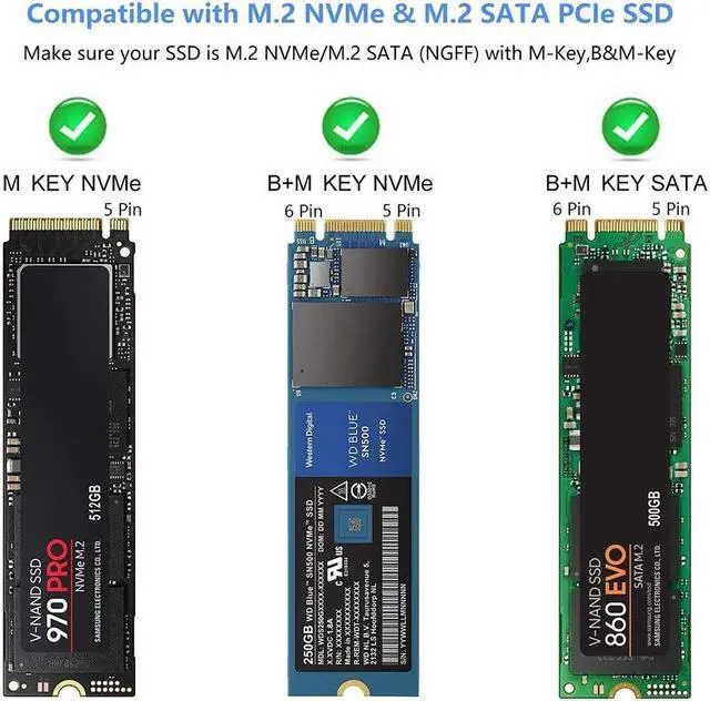Wide CompatibilityNVMe USB reader compatible with M.2 NVMe/SATA PCIe M key,PCIe B&M key SSD.Applicable to for NVME/SATA SSDs 2230/2242 / 2260 / 2280. (Note: NVMe and SATA SSD are not included). with M.2 PCIe AHCI SSDs, M.2 PCIe devices such as WiFi and capture cards, mSATA SSDs, and non-M.2 form factor SSDs