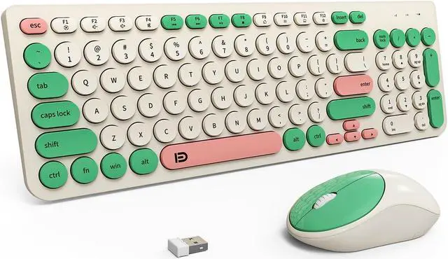 FD Wireless Keyboards and Mouse Combo - 2.4GH z USB Cordless, Cute Wireless Keyboard Round Keys, Quiet and Slim Set for Laptop, Computer, TV and Mac - Milky White Green Colorful