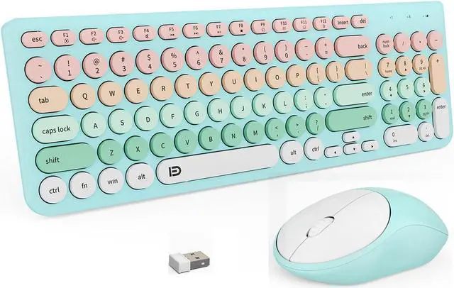 FD Wireless Keyboards and Mouse Combo - 2.4GH z USB Cordless, Cute Wireless Keyboard Round Keys, Quiet and Slim Set for Laptop, Computer, TV and Mac - Blue Pale Green Colorful