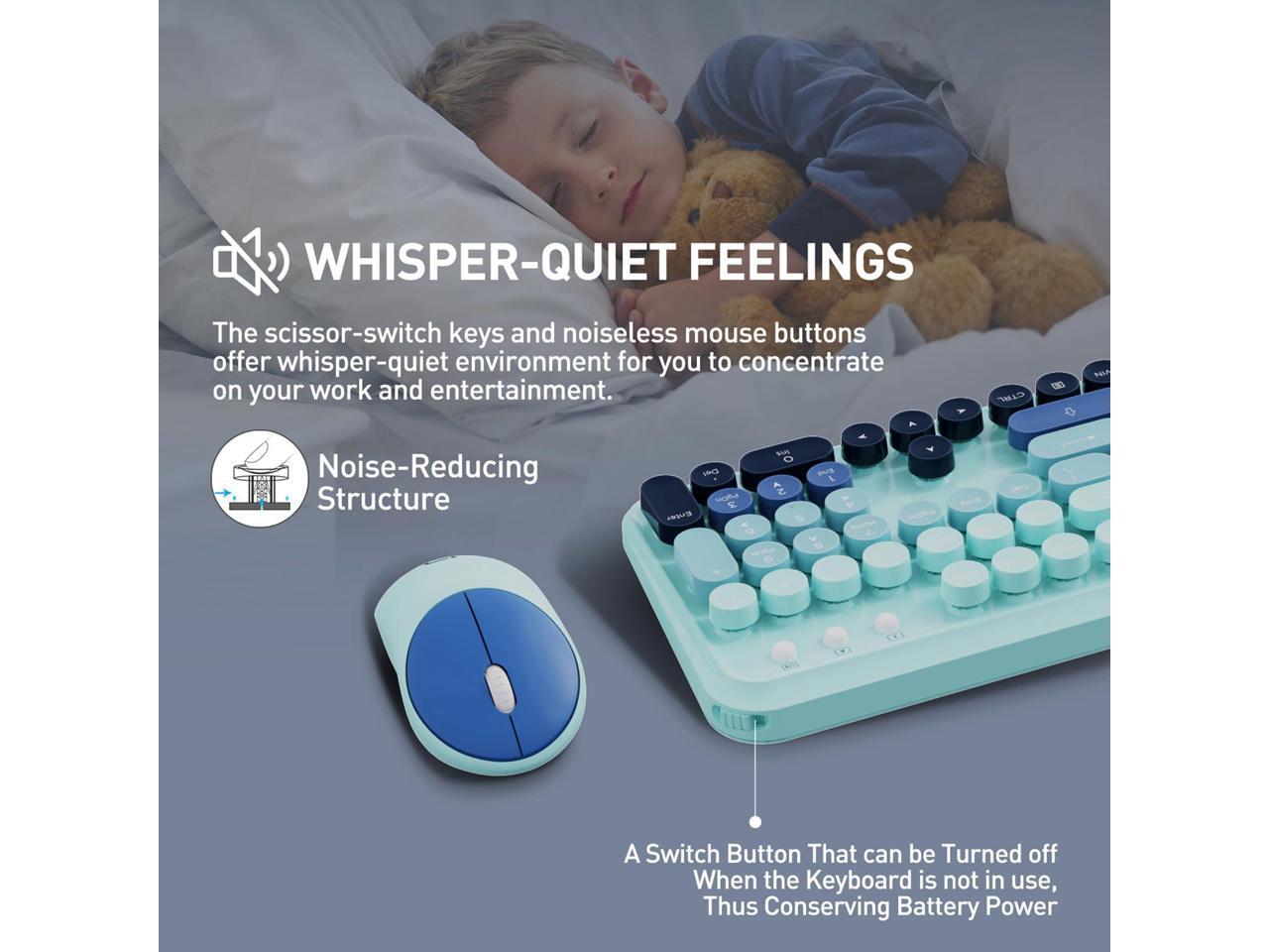 - Mouse and Keyboard Four Major Advantages : 1)Super large anti-slip silicone base enhances friction. 2)Laser-engraved high-definition characters with injection molding process, ensuring keycaps never fade. 3)Imported chip with pure-grade DSP environment noise reduction algorithm reduces key sound, solving the issue of multiple sets being used simultaneously in the same office without key skipping or interference. 4)keyboard Power-saving switch that helps conserve battery power.