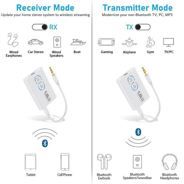 Receiver: 1Mii Bluetooth audio transmitter supports transmitter and receiver mode. In transmitter mode, it is very easy to turn a non-Bluetooth TV, PC, gym/ flight equipment into Bluetooth transmitter. In receiver mode, Bluetooth 5.3 chip ensures high fidelity Bluetooth audio signal for music streaming to those speakers or car/ home stereo systems that doesnt have the Bluetooth capability. ^^ Support aptX