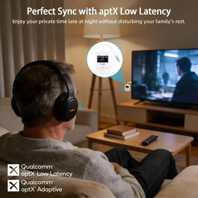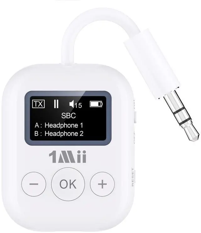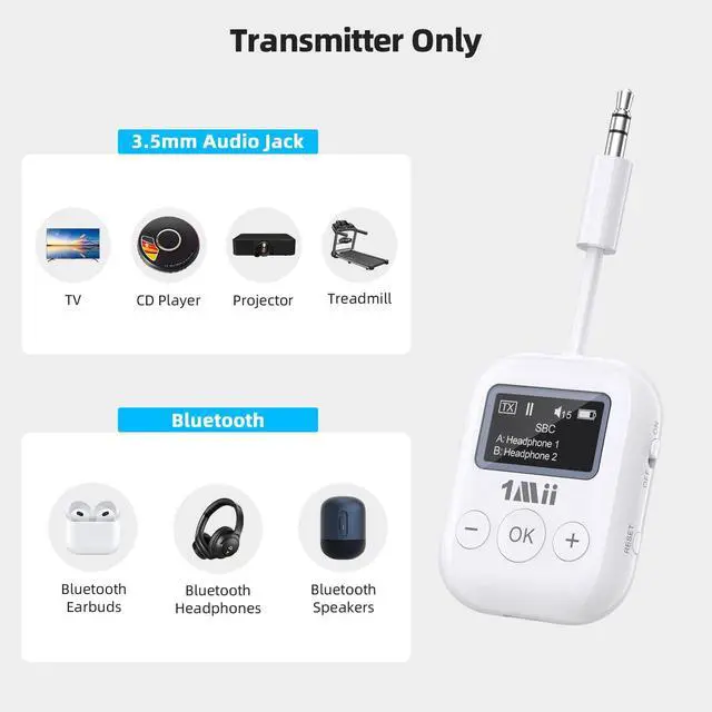 Transmitter Only Easily upgrade your non-Bluetooth devices with 3.5 mm AUX output TV, PC, CD player, MP3, projector, or treadmillinto Bluetooth-enabled systems. Enjoy wireless audio with Bluetooth headphones, turn up the volume, and create your private TV or movie night without disturbing others ^^ New User-friendly Screen Unlike typical transmitters with confusing blinking lights, the 1Mii Bluetooth transmitter features an easy-to-read screen, making setup and managing connections a breeze. The perfect gift for parents unfamiliar with complicated electronics ^^ aptX Hi-Fi Audio For Movies & TV Powered by the Qualcomm 5.3 chip, the 1Mii Bluetooth adapter supports aptX Adaptive, aptX LL, and aptX HD for high-fidelity audio.